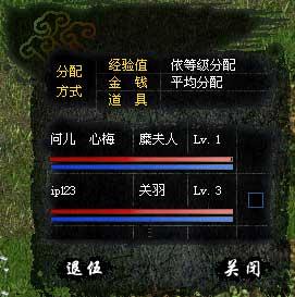 [ 乱世三国 ] 里有两种经验分配方式。 第一,级别类分配方式:跟打怪物没有直接的关系,级别高的人分配更多经验值的分配方式。 第二,贡献度类分配方式:跟组队成员的级别没有关系,打怪打得多的玩家获得更多的经验值的分配方式。玩家们可以根据自己的情况选择适当的分配方式。 ※ 以队长为标准,不能与级别相差 +10 级, -10 级的玩家组队。同一军团的玩家组队的时候则没有级别上的限制。