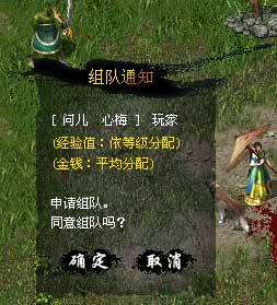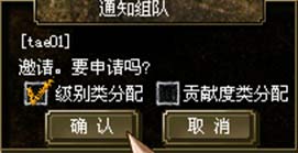 把光标移到想要组队的角色上面按 Ctrl + 右,会出现菜单, 4 个选项当中选择“组队”会出现组队申请栏。首先选择“级别类分配,贡献度类分配 ”中的一种分配方式,点“确认”就能给对方发送申请。打猎的时候收到组队的邀请,可以先确认一下经验分配方式之后,再考虑接不接受组队。※ 注意:不能与其他国家的玩家组队。
