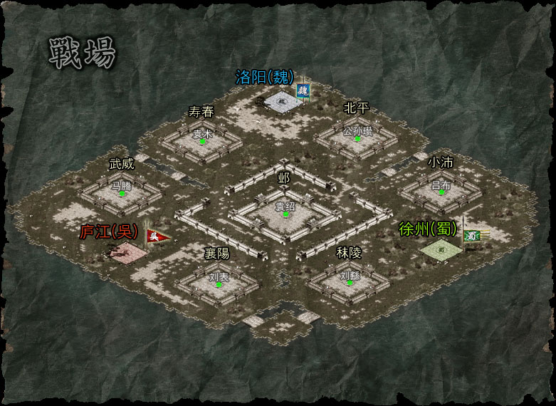 每个国家的主城地点都不同,魏是洛阳、蜀是徐州、 吴是庐江。所以开始群雄割据之前得先熟悉一下战场的地形。
